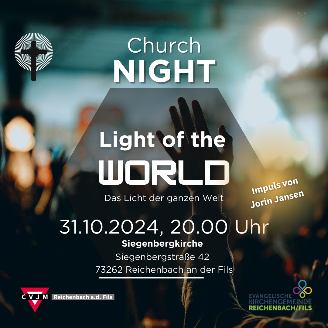 Wenn die Nächte länger werden und die Dunkelheit immer mehr Raum einnimmt, dann wird es Zeit, Lichter scheinen zu lassen. Und welches Licht könnte strahlender sein als Jesu Licht, das Licht der ganzen Welt? Lasst uns Sein Licht loben und weitergeben. Dazu laden wir ein bei der Church Night am 31. Oktober. Wir treffen uns ab 20 Uhr in der Siegenbergkirche. Pastor Jorin Jansen wird mehrere Impulse zum Thema "Light of the world" geben. Anni mit Band sorgt für starken Lobpreis. Auch das leibliche Wohl kommt dank Snacks und Getränken nicht zu kurz. Später am Abend gehen wir mit Fackeln hinaus, um das Licht in Reichenbach hell strahlen zu lassen.