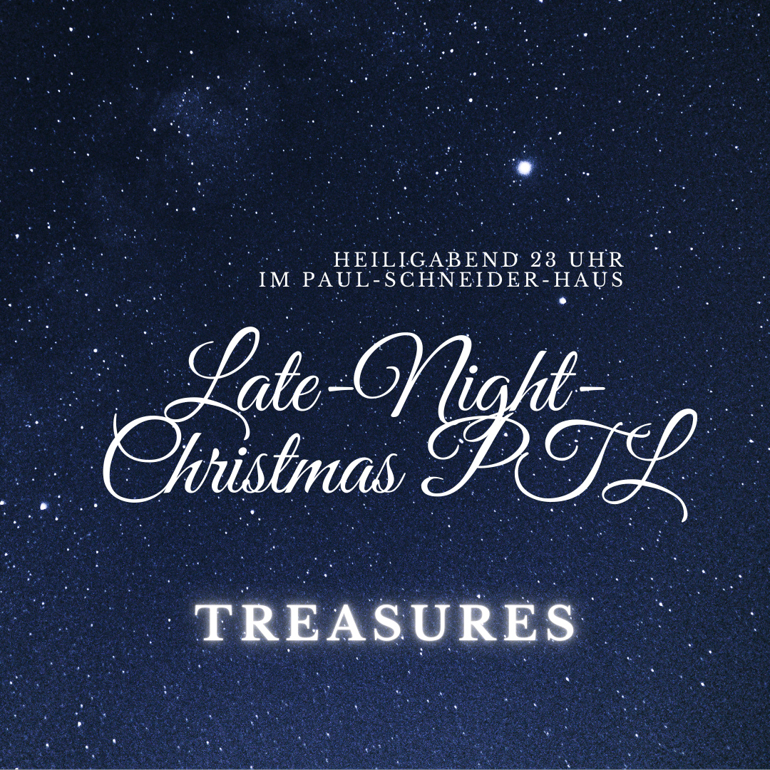 Am 24. Dezember laden wir ein, den Heiligabend in einem besonderen Lobpreisabend zu verbringen. Anni wird den Abend zum Thema "treasures" gestalten. Wir möchten gemeinsam in der Stille und im Licht der Weihnacht den wahren Schatz Gottes entdecken. Zum Abschluß dieses besonderes Abends wollen wir gemeinsam Gott preisen und uns auf ihn konzentrieren, Wir wollen innehalten und die Gemeinschaft und den Frieden genießen.